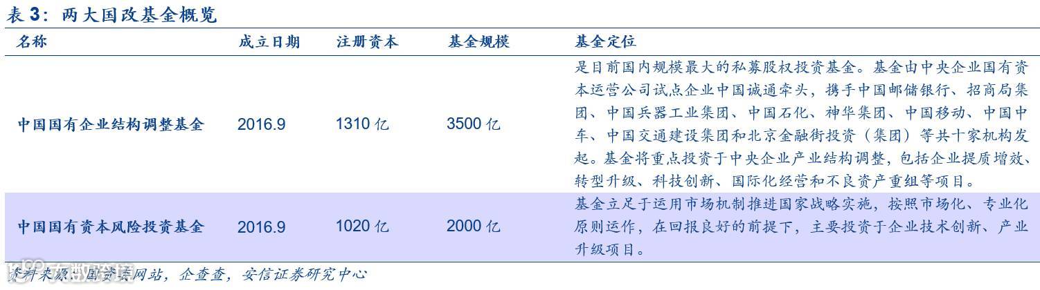 2016年12月9日,国资委召开国企改革专题发布会,国资委宣布设四只产业基金并注入国有资本,并设立风投基金。国协、国同、国创、国新4支引导基金,这四家基金的第二个字连起来就是协同创新。上述四只产业引导基金分别由航天科技、招商局集团、中国国新和国家开发银行所属的国开金融牵头设立,基金总规模达4300亿元,首期规模超过1500亿元。目前中央企业发起和参与的基金超过200支,总规模超过6000亿元。其中,中国国新主导设立了2000亿元规模的“中国国有资本风险投资基金”。诚通集团以资本运营促结构调整,主导设立了3500亿元规模的“中国国有企业结构调整基金”。
