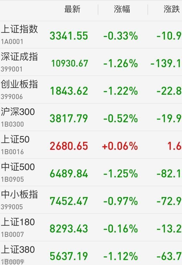 1、A股:上证综指收盘跌0.33%报3341.55点,盘中创一个月新低;深成指下挫1.26%报10930.67点;创业板跌1.22%报1843.62点。两桶油、四大行尾盘拉升,护盘仍难救主。两市成交4685亿元,上日为4873亿。