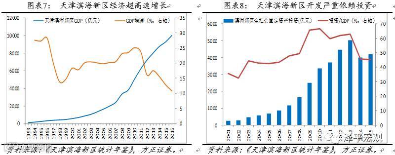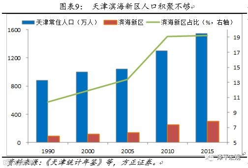 滨海新区开发以在大投资、大项目、大工业为特点,比如2015年全社会固定投资/GDP的比例为45.4%,远高于同期深圳的18.8%、浦东的22.5%。在此拉动下,1993-2016年天津滨海新区GDP从112亿快速增至1万亿,二产比重达60%以上,当前航空航天、汽车、装备制造、新材料、生物医药等八大产业占规上工业总产值比重达到87%;常住人口从1990年的92万人增至2000年119万,再增至当前的300余万。这使得滨海新区以占天津1/5的土地,创造了约56%的GDP、3/4的二产增加值,但只集聚了1/5的人口,优化天津城市空间布局的功能有待提高。虽然滨海新区GDP在2008年超过浦东,2016年为浦东的115%,但人均收入明显较低、人口聚集能力较弱,且其对周边地区的辐射带动能力不足,而且在新形势下这种模式难以复制。