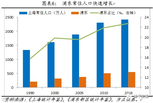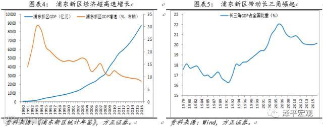 因中央政府赋予一系列特殊政策,浦东新区创下多个“第一”,包括第一个证券交易所、第一个外资银行、第一个外资金融机构经营人民币业务试点、第一个国家综合配套改革试验区等。1990-2016年,浦东新区GDP从60亿元快速增至8782亿元,常住人口从不到140万(含并入的南汇区后人口210万)增至550万。建设浦东新区使上海从相对单一的工业生产基地转变成一个国际性的多功能中心,大幅优化了上海城市空间布局,并有力带动了长三角地区经济发展。当前,浦东以上海市1/5的土地、近1/4的人口,创造1/3的GDP、1/2的金融和外贸进出口、近100%的远洋航运。此外,与深圳类似,浦东也存在规划不够超前的问题,比如1992年规划2000年人口180万,实际2000年达240万。