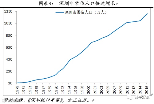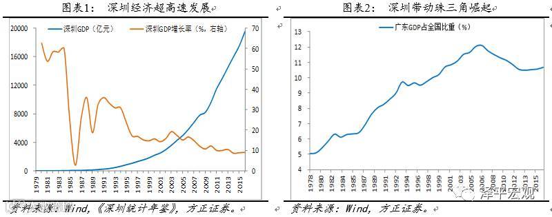 总的来看,由于毗邻港澳、政策优势及体制机制灵活等因素,深圳从上世纪八十年代大力发展“三来一补”加工业开始起步,到九十年代着力打造以电子信息产业为龙头的高新技术产业,再到本世纪前十年初步构建起以高新技术产业、金融业、物流业、文化产业为支柱的现代产业体系,产业不断转型升级,发展为全国一线城市。1979-2016年,深圳市GDP从近2亿元快速增至1.95万亿元,常住人口从31万人增至1191万人。深圳带动了整个珠三角地区的经济增长,使之成为中国经济的重要一极。但是,因低估经济增速、非普查年份人口统计偏差及预测失误等,深圳城市规划在早期不断被迫调整,规划不够超前以及规划调整的滞后性也成为造成深圳当前“大城市病”的重要原因之一。比如,《深圳统计信息年鉴1997》记载的1996年深圳市常住人口为358万人,但后经2000人口普查数据调整后为483万人。《深圳市城市总体规划(2010-2020年) 》记载2007年底深圳常住人口为862万人,但后据2010年人口普查数据调整为912万人。2015年,深圳市常住人口达1137万人,提前五年超过了《深圳市城市总体规划(2010-2020年) 》提出的2020年1100万人目标。此外,深圳存在大量城中村,城市更新任务艰巨。深圳是我国土地财政先行先试者。1982年开始征收土地使用费,1987年秋率先开始国有土地使用权有偿出让试水,开启“土地财政”模式。1992年深圳宣布将特区内土地国有化,2004年宣布将全市土地国有化,但因补偿标准未达成一致,不少原农村土地实质上仍属于村集体所有,出现不少违建,安全隐患突出、并严重影响城市面貌。2009年深圳市开始进行城市更新,虽取得较大进展,但任务依然艰巨。