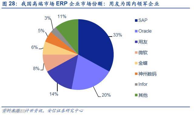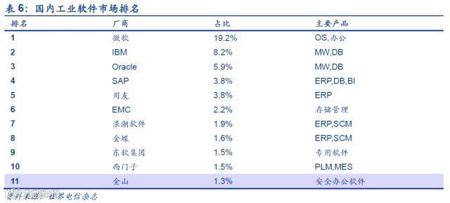 设计研发类工业软件国内起步较晚,主要集中在低端市场,如二维CAD等;生产控制类目前国内普及率也比较低;运营管理类软件市场仍被国外企业如SAP和Oracle占据,但国内企业凭本土优势,尤其是ERP软件,目前渗透率相对较高,其中用友网络是国内ERP软件的领导者。