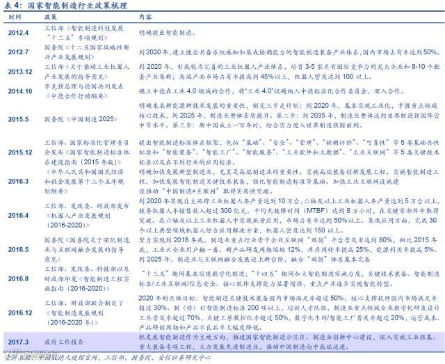 国家对第四次工业革命尤为重视,在2014年李克强总理与德国签订的《中德合作行动纲要》中明确了两国在工业4.0领域的深入合作。在2015年发布《中国制造2025》后,国务院、工信部、财政部等相继发布《十三五规划纲要》等一系列政策文件。在今年的政府工作报告提到把发展智能制造作为主攻方向,推进国家智能制造示范区、制造业创新中心建设,深入实施工业强基、重大装备专项工程,大力发展先进制造业,推动中国制造向中高端迈进。在5月17日召开的国务院常务会议上,李克强总理提到需深入实施《中国制造2025》,并再次强调将智能制造作为主攻方向。今年5月25日,工信部下发通知组织开展中德合作试点工作。在6月1日,在德访问的李克强总理同德国总理默克尔进行小范围会谈后,见证关于智能制造等双边合作文件的签署。在7月的第二届中国装备制造业智能制造论坛以及第一届中国(武汉)智能制造大会的密集催化下,智能制造在政策和产业的推动下迎来进一步发展。