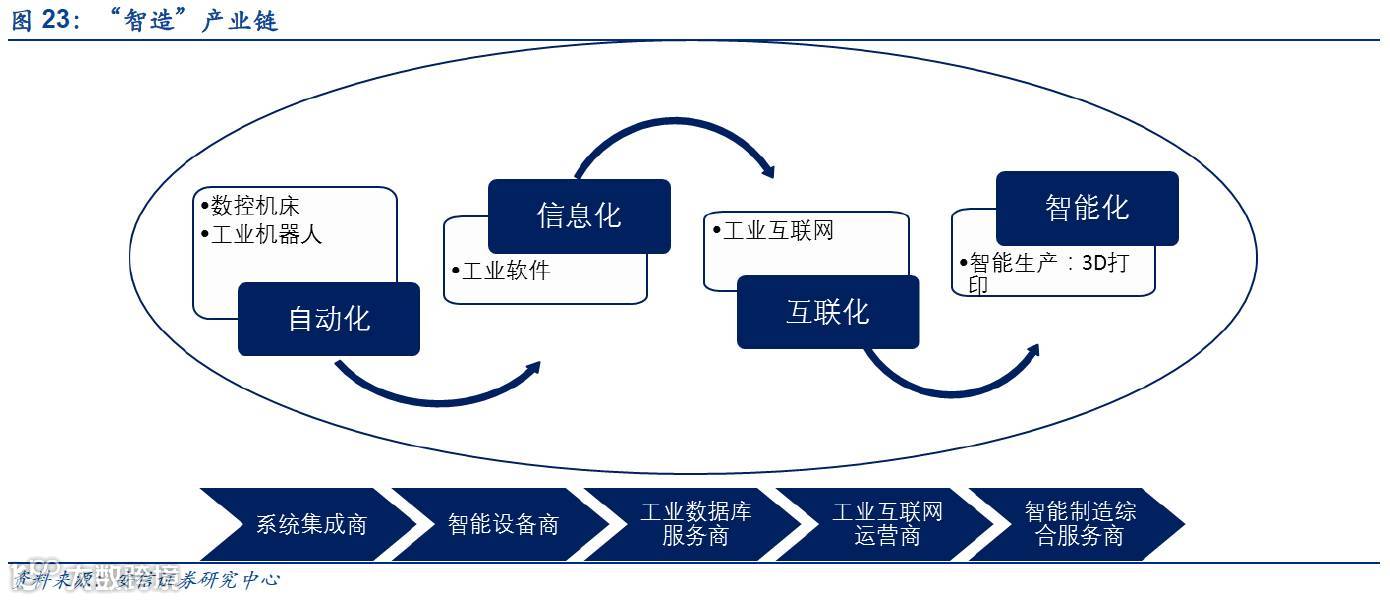 智能制造发展需经历自动化、信息化、互联化、智能化四个阶段。自动化主要是指自动化装备,信息化则主要指工业信息化,互联网包括工业互联/物联网,智能化则包括智能生产。自动化装备包括工业机器人和数控机床两个部分。工业信息化以工业软件为主,具体划分为系统软件(服务于计算机)、应用软件和中间件。工业互联/物联网目前包括国内RFID、机器视觉技术,智能生产主要是指全产品生命周期的数字化生产。自动化、信息化、互联化和智能化是一个环环相扣的递进关系,互联和智能建立在自动和信息化的基础上。