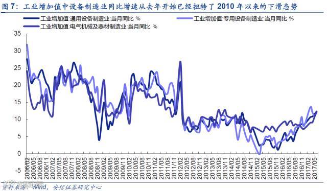 如果我们观测工业增加值中设备制造业同比增速数据可以发现,通用设备制造业、专用设备制造业、电器机械级器材制造业的同比增速已经从去年开始明显回暖。