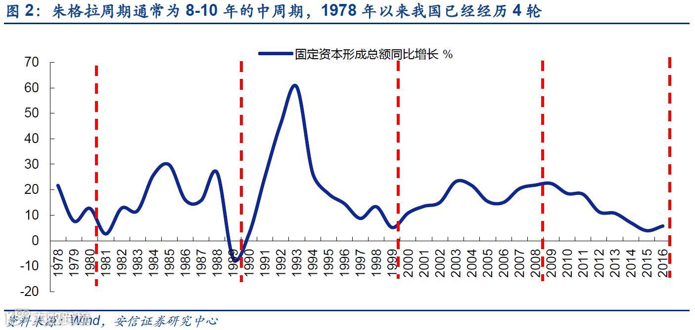 在经济理论中,朱格拉周期通常为8-10年的中周期,主要与政治周期、设备更替周期有关。由于其一般对应生产设备的更替、改造、升级,因此固定资本形成总额同比增长是较好的观测指标。1978年以来,我国已经经历了4轮朱格拉周期。