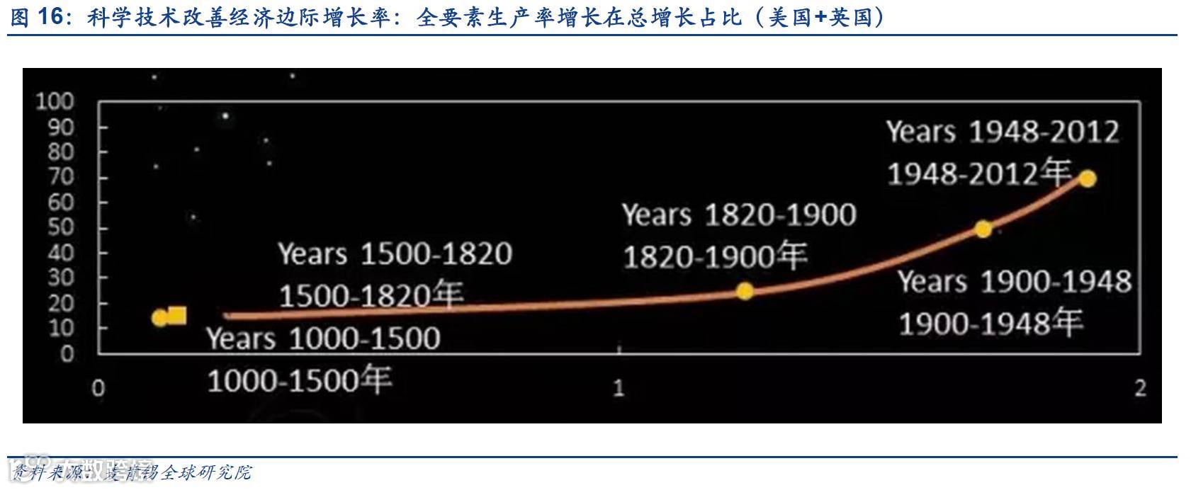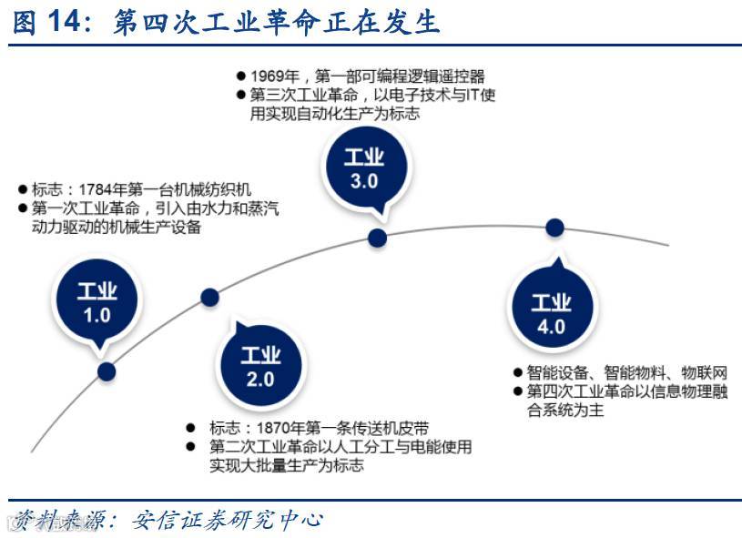 历史上以蒸汽机、电力设备、计算机为代表的前三次工业革命已经向世人证实了工业崛起的重要性。工业1.0依靠机械生产,工业2.0融入电的元素,实现电气化生产,工业3.0时代则强调自动化生产,而迈入工业4.0时代的智能制造则是在生产基础上增加“智能”属性。智能化的4.0相对于自动化的3.0区别在于数据化的分析和结果处理。在每一次工业变革中,技术对经济边际增长率有极强的改善作用。原因一方面在于科学技术有助于企业突破原有增长瓶颈,另一方面高科技有助于企业形成技术壁垒,进入高端市场,脱离原有的竞争环境。