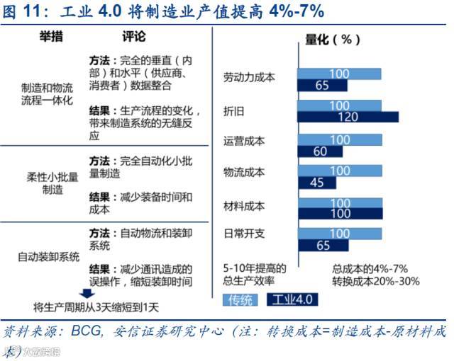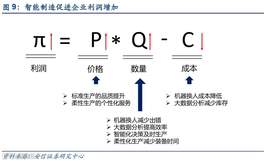 我国上一次大规模进行固定资产投资是在2009年,即将进入一轮新的设备采购周期。我们观测工业增加值中设备制造业同比增速数据可以发现,通用设备制造业、专用设备制造业从去年已经开始明显回暖。而我们认为新一轮设备投资周期就是智能制造最好的一个发展渗透阶段,智能制造相对传统制造业而言,企业总效益提高。优势在于提高产品品质、增加产出量,以及降低生产成本。