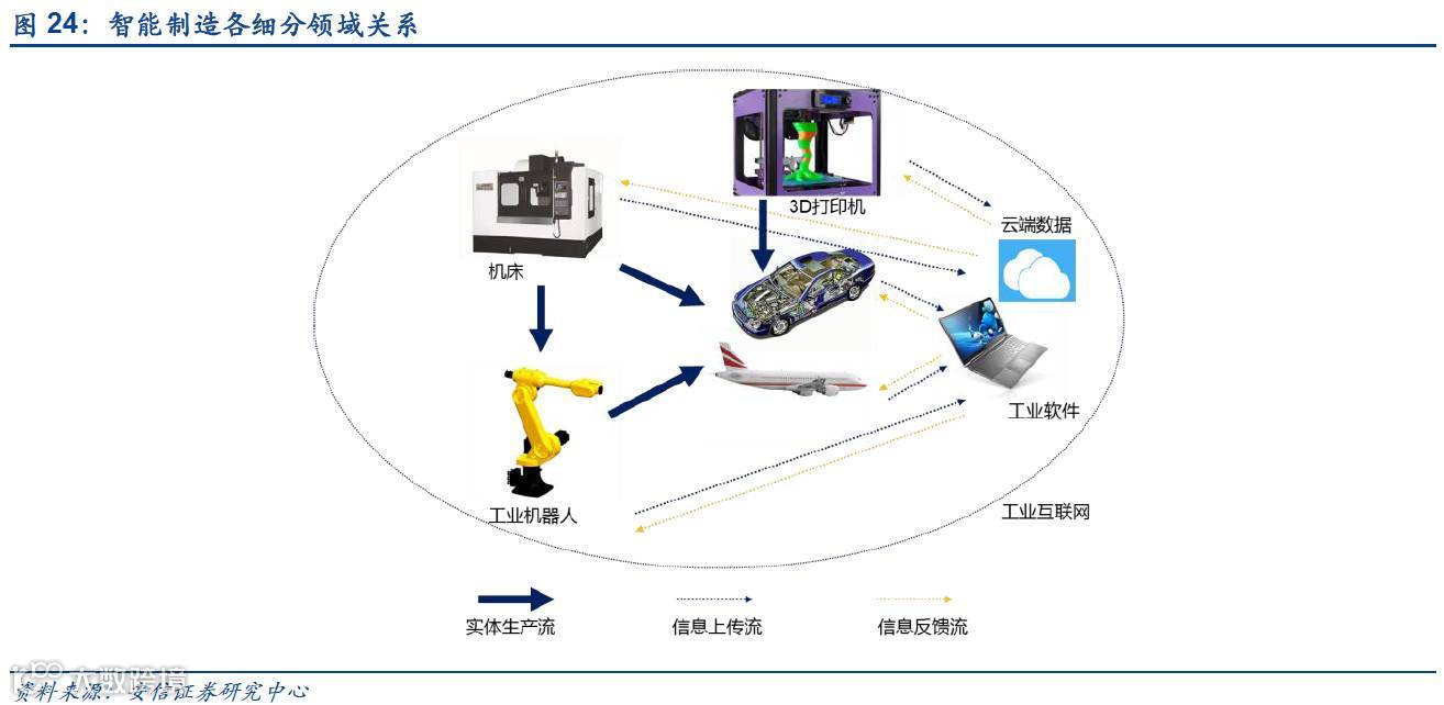 智能制造各细分领域存在关系。机床是所有制造设备的基础,可用于生产工业机器人、汽车、航空设备等。而工业机器人也可以用于生产下游汽车、航空航天设备。机器人、机床以及包括汽车等所有端设备通过联网或者传感器等将数据传至云端,云端经过大数据分析后,形成解决方案再反馈给需要的产品,整个环节在工业互联网下完成。在3D打印设备成熟后,可以通过3D打印设备直接生产产品,提高效率。
