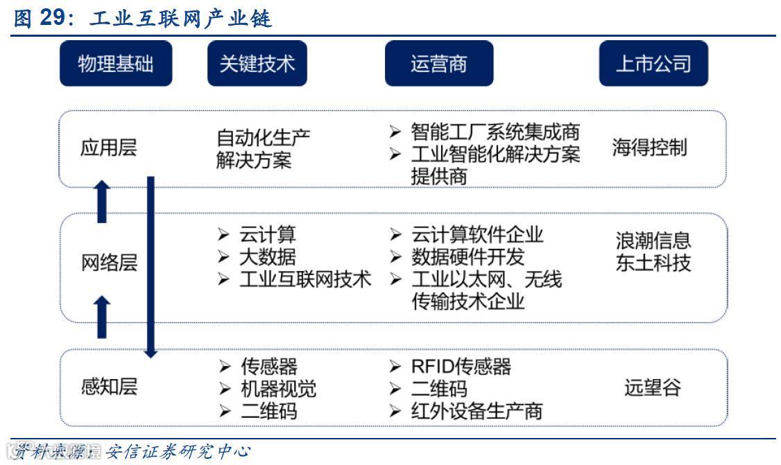 应用层解决方案的提供商,网络层包括接入服务商、系统集成商等,网络层的系统集成商主要是针对下游硬件产品的集成。感知层主要是设备提供商,包括射频、传感器等,由于感知层的技术壁垒低,相对、而言,感知层企业数量多,是主要竞争市场。网络层是掌握云计算、大数据以及其他相关技术的核心层,在整个工业互联网产业中占据核心地位,也是我国需要大力发展和推进的领域。我国两化(工业化和信息化)融合和互联网+是工业互联网发展的一个方面。2016年国务院发布《关于深化制造业与互联网融合发展的指导意见》指出,支持制造企业建设基于互联网的“双创”平台,深化工业云、大数据等技术的集成应用。今年的政府工作报告强调实施加快大数据、云计算、物联网应用,以新技术新业态新模式,推动传统产业生产、管理和营销模式变革。