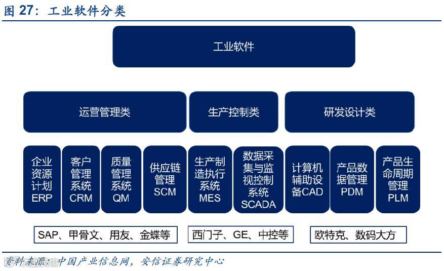 工业软件的应用软件分为运营管理类、生产控制类和研发设计类三大领域。运营管理类主要包括ERP、CRM、QM、SCM等,该领域的主要的企业有用友网络、甲骨文、金蝶、SAP、Salesforce等;生产控制类则主要包括MES、SCADA等,主要企业包括西门子、通用、中控集团等;研发设计类主要包括CAD、PDM、PLM等,主要企业有欧特克、数码大方等。