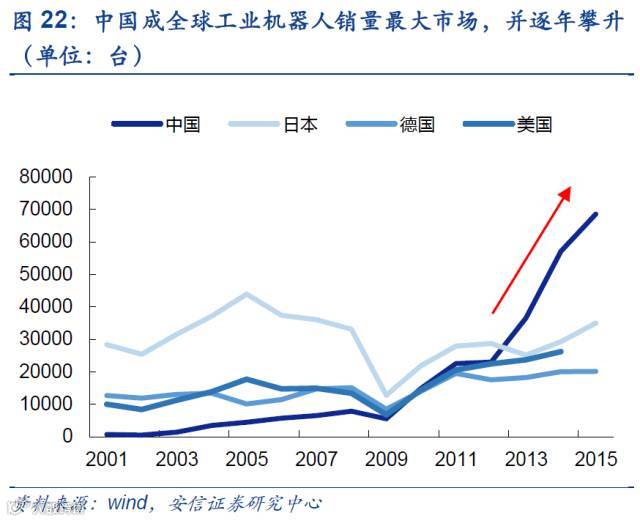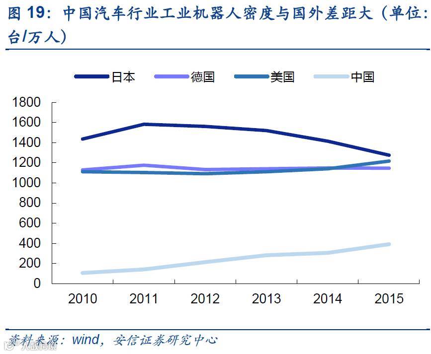 以机器人为例,我国工业机器人的使用密度远低于国外,机器换人的空间大。在具体细分领域的应用中,如目前工业机器人的主要输出领域汽车行业中,国内的机器人密度远低于国外,2015年日本汽车行业的工业机器人密度是中国的3.25倍。