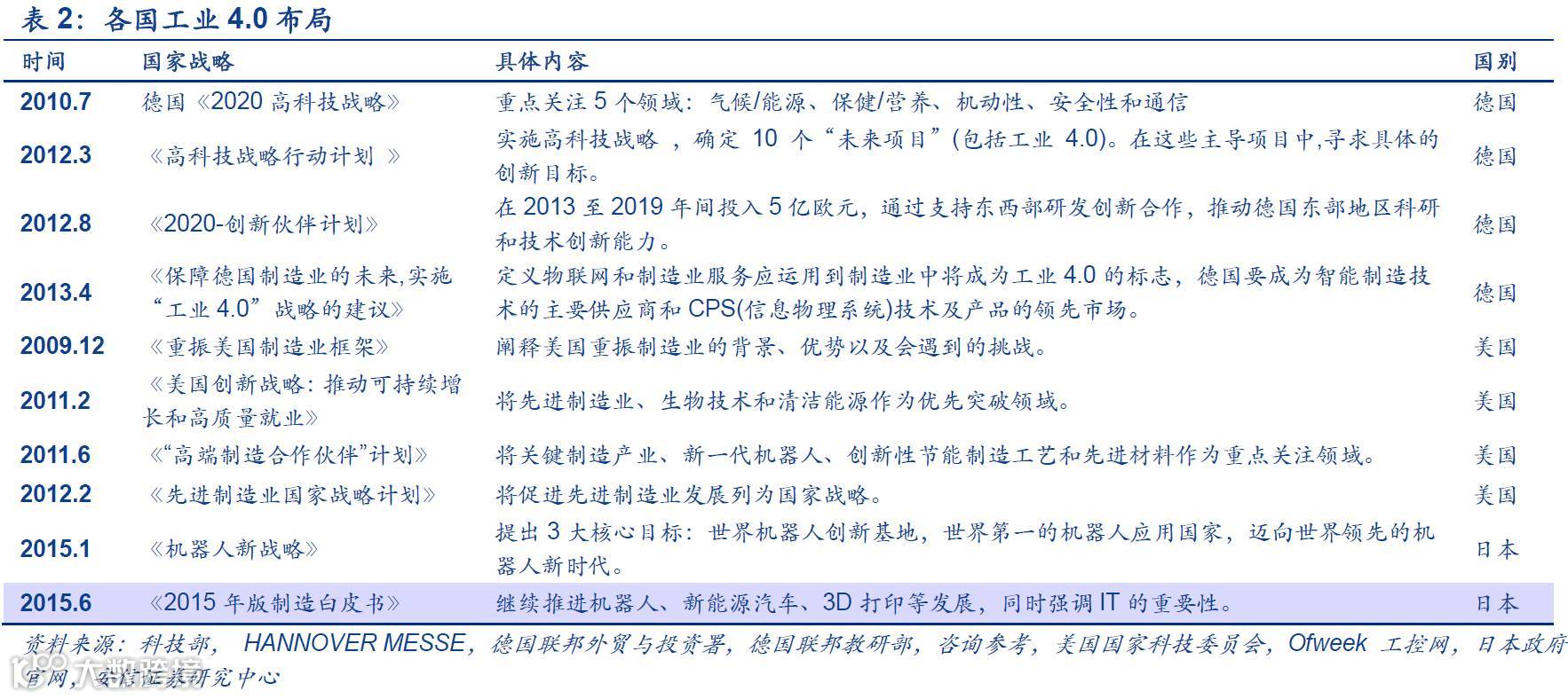 虽然我国制造业体量大,但是在高端制造业领域仍非常薄弱。目前国内工业大部分工业处于2.0到3.0过渡的状态,少部分开始迈入4.0。国外工业4.0发展起步早,目前以德国和美国为首的国家处于以品牌核心技术为主导阶段,日本和韩国则处于大规模集成电路芯片、关键元器件和高端消费电子产品为主导阶段。中国则还处于制造业中低端,主要以生产零部件中间件,以及劳动驱动的制造业为主。目前我国大部分企业集中在系统集成商领域,部分企业也尝试进入智能设备行业,但是进入智能设备的核心领域的企业仍为少数。