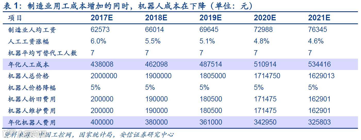 在用工成本不断增加,机器人工艺成熟而成本减小的的情况下,机器人的可替代性将渐趋升高。目前的工业机器人由于种类较多,价格不等。根据OFweek机器人网的新闻报道,汽车厂购置的一台大型喷涂机器人,初始购置成本200万,三班倒计算可代替7个工人。根据日经中文网的调研数据显示工业机器人的平均使用期限是10年,假设每年维护和折旧均是机器购买价的十分之一,以此进行测算。根据Ofweek的数据显示,目前机器人的价格以每年的5%的速度下降。国家统计局统计的近几年制造业城镇单位就业人员工资情况表明工资增速放缓,2014年和2015年的增速分别为10.6%和7.7%,后续会进一步放缓。我们以边际递减速度放缓来估计之后几年的工资增长情况。从2017年开始机器人的成本已经低于人工成本,后续成本优势还会持续加大。
