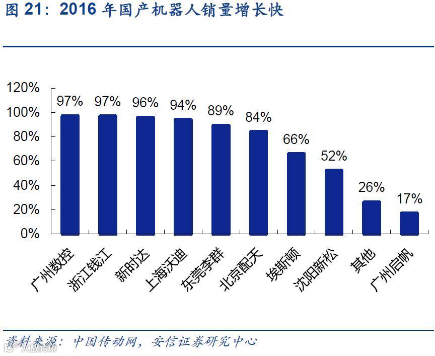 埃斯顿:以数控系统起步,后续业务延伸到伺机系统领域,2011年进入工业机器人领域。2016年工业机器人及智能制造系统实现收入2.11亿,同比增长167%,收购全球十大控制器厂商之一TRIO,目前公司在智能装备领域拥有数控系统、电液伺服系统和交流伺服系统三大技术平台,除了高精密减速机以外的核心零部件均已实现自主化生产。公司的发展重心也从核心零部件(伺服系统)向本体延伸。公司的工业机器人以高精度六轴机器人为主,2016年销售超1000台,超过公司总销量的80%,未来发展空间大。