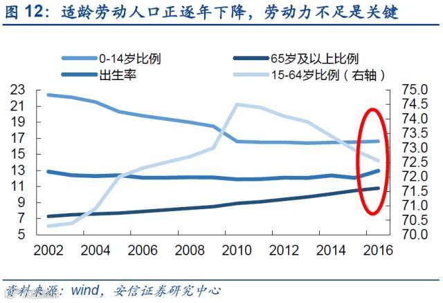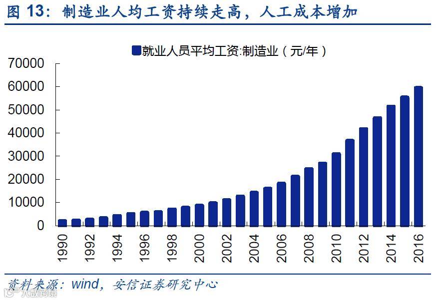 劳动力作为影响制造业发展最重要的要素之一,是促使我国制造业升级的重要原因。近年来民生改善劳动力工资上涨,以及出生人口下降带来的适龄劳动力人口规模缩小导致的用工荒,是造成我国制造业成本快速攀升的主要原因。我国统计局的统计结果表明,当前我国15-64岁适龄劳动力人口正逐年下降,0-14岁青少年人口也呈现总体下降的趋势,在出生率没有出现明显改善之前,适龄劳动力人口的比例将会持续缩小,劳动密集型行业的用工荒问题在现有生产模式下将会长期存在。因此在制造业的工业增加值走低,用工成本不断抬升的背景下,制造业升级,尤其是劳动依赖型制造业的升级已经到了关键阶段。