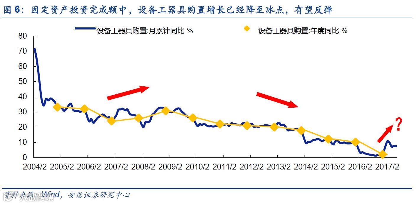 固定资产投资完成额中设备工器具购置的同比增长,已经从2008年的30.7%下跌到2016年的2.1%,可谓降至冰点。未来有望随着新周期的开启和制造业复苏重回上升轨道。月累计同比的变动已经预示了这一点。