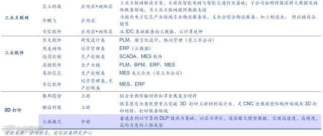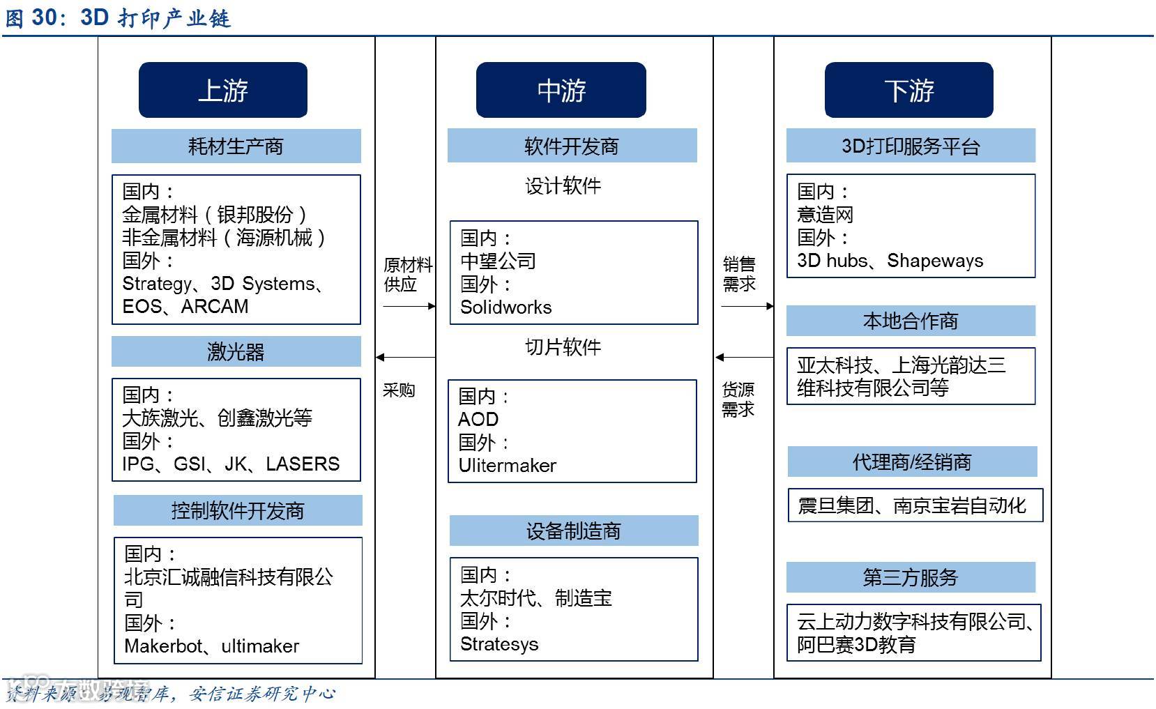 3D打印上游主要是原材料提供商,包括耗材、激光器和控制软件的开发。中游包括软件开发商和设备制造商,下游则是3D打印服务平台和本地合作商、代理商/经销商、第三方服务等提供服务为主的厂商。其中中游的设备制造商是基础。中游设备大致分为高端和低端两类,大多数中小企业的产品集中在门槛较低的低端设备领域,高端设备则是基于激光熔覆技术;上游原材料是关键,上游原材料决定了产品的材质和性能,此外上游还包括逆向工程软件、CAD软件、数据修复等技术类工作;下游则决定了市场空间。