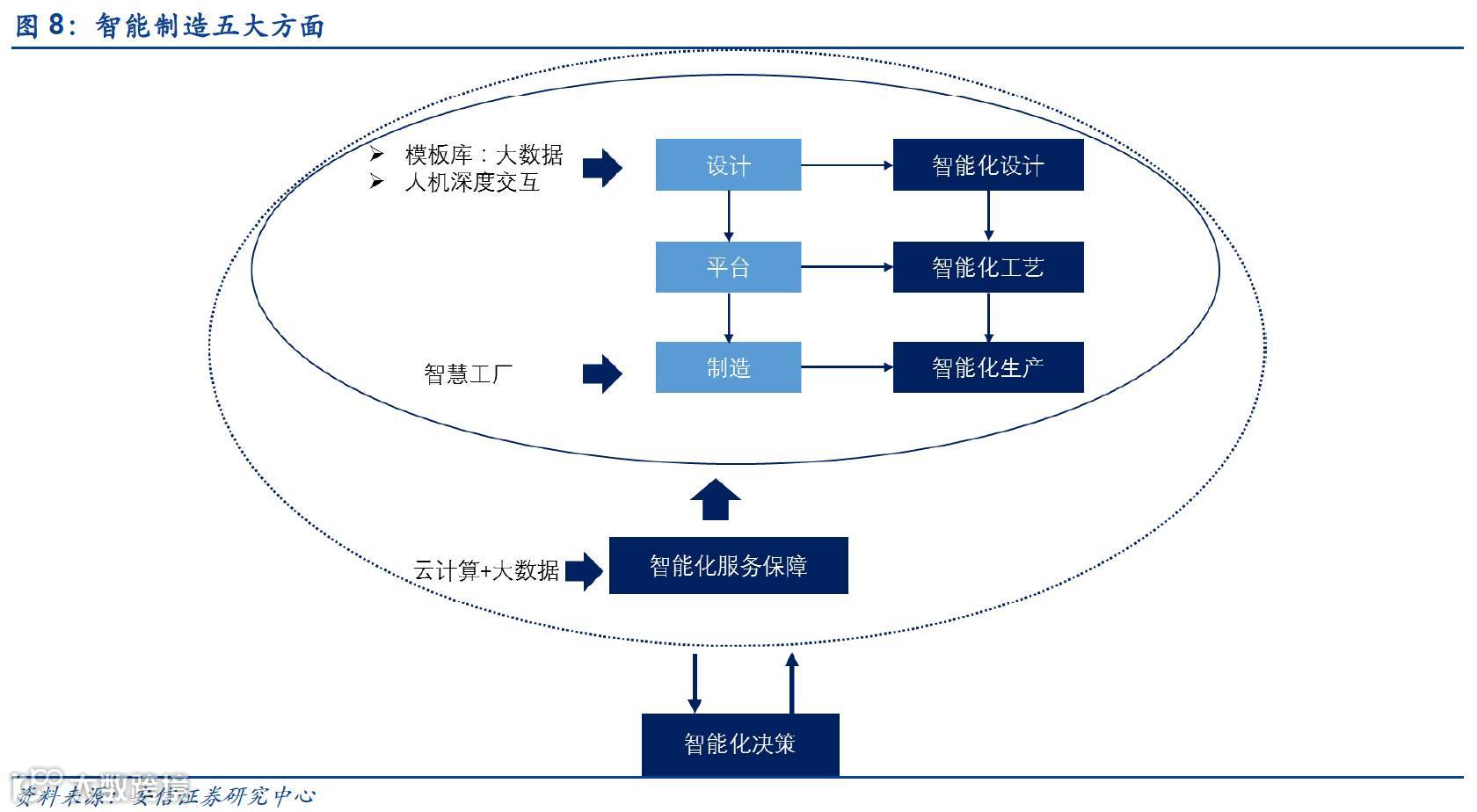 • 智能化生产:分为智能化设备、单元、生产线、车间、工厂和产业链六个层次。从自动化的设备开始,形成生产设备单元,根据需求组成自动化的生产线,建立自动化车间,最后部署成数字化工厂,其中对复杂产品构建自动化工厂的产业联盟。