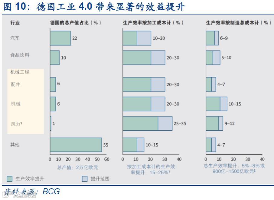 产出量增加的原因在于产出率的提高。机器的不间断工作和程序化操作在减少出错率的同时提高产出率。其次柔性化生产可以减少装备时间。此外,通过大数据分析和智能化决策可以减少响应时长。波士顿咨询报告中指出,在研究德国工业4.0中发现,德国的制造业产值从900亿提升到1500亿欧元,同时生产率提高15%到25%。因为在相同的材料下,运用工业4.0技术,可以提高利用效率,从而增加产出率。