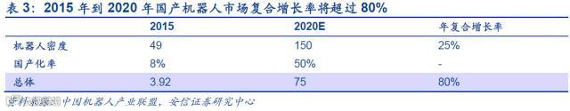 根据机器人规划,到2020年,中国自主研发工业机器人年产量达到10万台,密度达到150以上,根据2015年工业机器人密度为49,可得工业机器人在未来将以25%的复合增长率增加。同时在国产化率提高的基础上,我国国产机器人的复合增长率将达到80%。叠加随着工艺和技术成熟带来的生产成本降低,预计到2020年我国国产机器人利润复合增长率将超过80%。