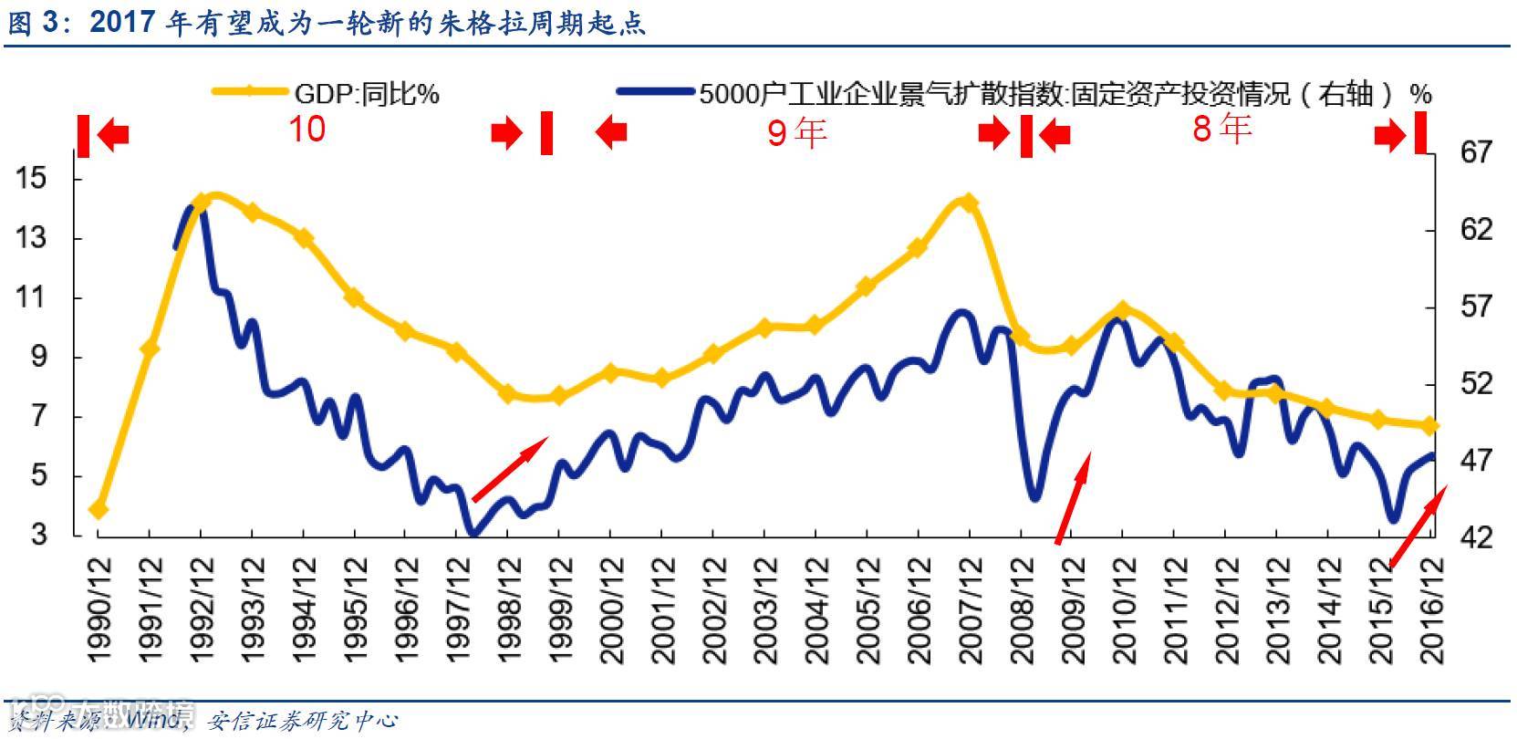 中国经济最近的三轮朱格拉周期分别为1990-1999年、2000-2008年、2009-2016年,进入2017年,有望开启一轮新的朱格拉周期,在GDP企稳回升之前,更加灵敏的5000户工业企业景气扩散指数(固定资产投资情况)指标的回升已经预示了新周期的起点。