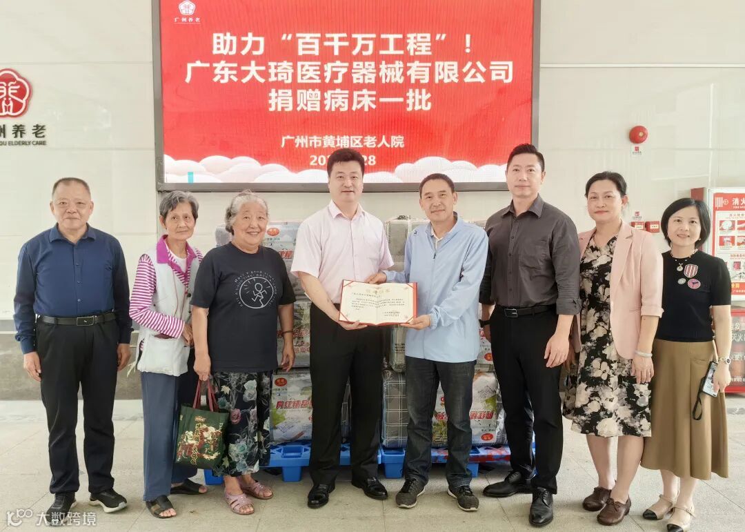 3月初,在获知黄埔区老人院为方便老年人就医正在建设护理院,但病床购置费用尚未落实时,公司领导层就捐赠病床等具体事宜开展会议,并立即与黄埔区慈善会、黄埔区老人院领导取得联系,踊跃捐赠100张手摇式病床及床头柜。黄埔区民政局一级调研员、慈善会会长熊义民在捐赠仪式上表示,广东大琦医疗器械有限公司支持养老服务事业发展和公益事业的善举充分体现了企业的责任和担当,不仅将“全心全意为人民健康事业服务”的使命放在心上,更落在实处上,为解决国家“人口老龄化”答卷贡献了完美答案。