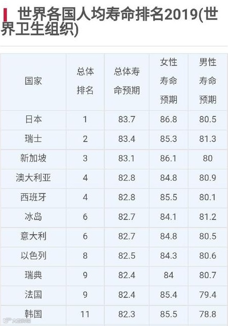 据2019世界卫生组织人类平均寿命统计:日本凭借高质量的医疗服务依旧排名第一,平均年龄83.7,女性86.8,男性80.5,中国排名第53,人均寿命为76.1,女性77.6,男性74.6。除日本外,排前十的国家依次是:瑞士、新加坡、澳大利亚、西班牙、冰岛、意大利、以色列、瑞典、法国和韩国。