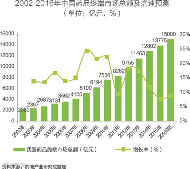 2015年医药终端市场总体规模13775亿元(按零售价计算,下同),同比仅增长7.6%,增速比2014年大幅下降5.6个百分点,创近十年来历史新低。