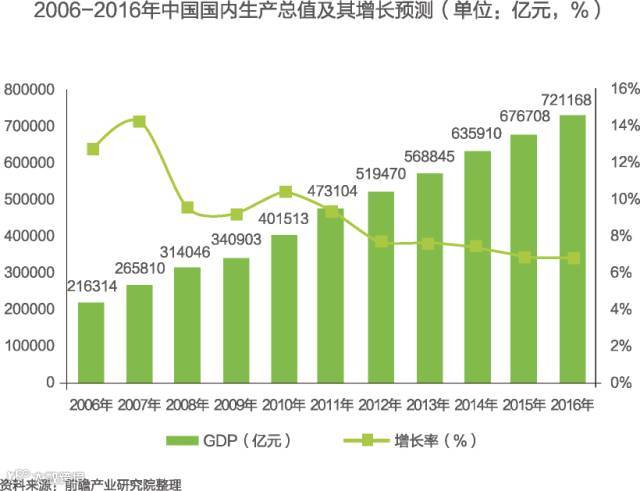 据国家统计局公布的数据,2015年,中国国内生产总值增速放缓。2015年,中国国内生产总值为676708亿元,按可比价格计算,同比增长6.90%。分产业看,第一产业增加值60863亿元,增长3.9%;第二产业增加值274278亿元,增长6.0%;第三产业增加值341567亿元,增长8.3%。预计2016年我国GDP将保持6.8%左右增速,达到72万亿元。