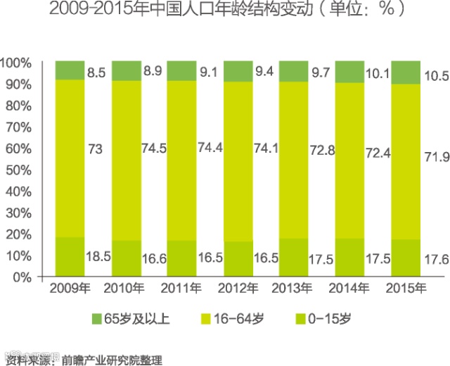 从60岁以上老年人人口占总人口的比例变化来看,呈逐年上升趋势,截至2015年底,我国60周岁及以上人口22200万人,占总人口的16.1%;65周岁及以上人口14386万人,占总人口的10.5%。有关专家预测,到2050年,中国老龄人口将达到总人口的三分之一。