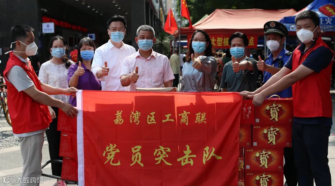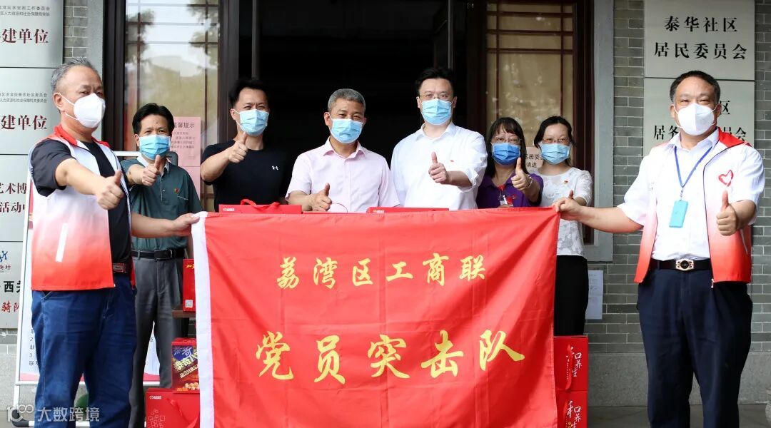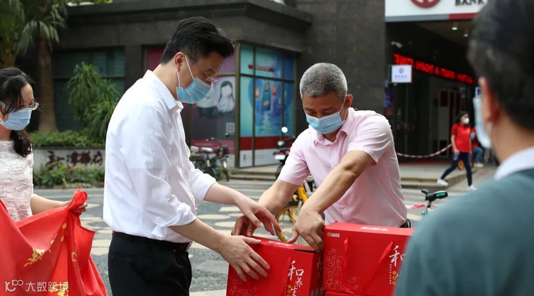 4月12日下午,荔湾区工商联主席、大翔集团董事长陈东平,荔湾区工商联党组书记、常务副主席肖灿强等区工商联主要领导来到逢源街道龙津华府核酸检测点和多宝街道永庆坊泰华社区核酸检测点,为他们送去矿泉水、八宝粥等物资,慰问坚守在抗疫一线的社区工作人员。