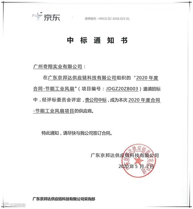 奇翔人不畏艰难,逆行而上,团结协作,历时三年的真诚服务,于2020年5月7日拿下与京东的节能工业风扇项目中标协议落地!
