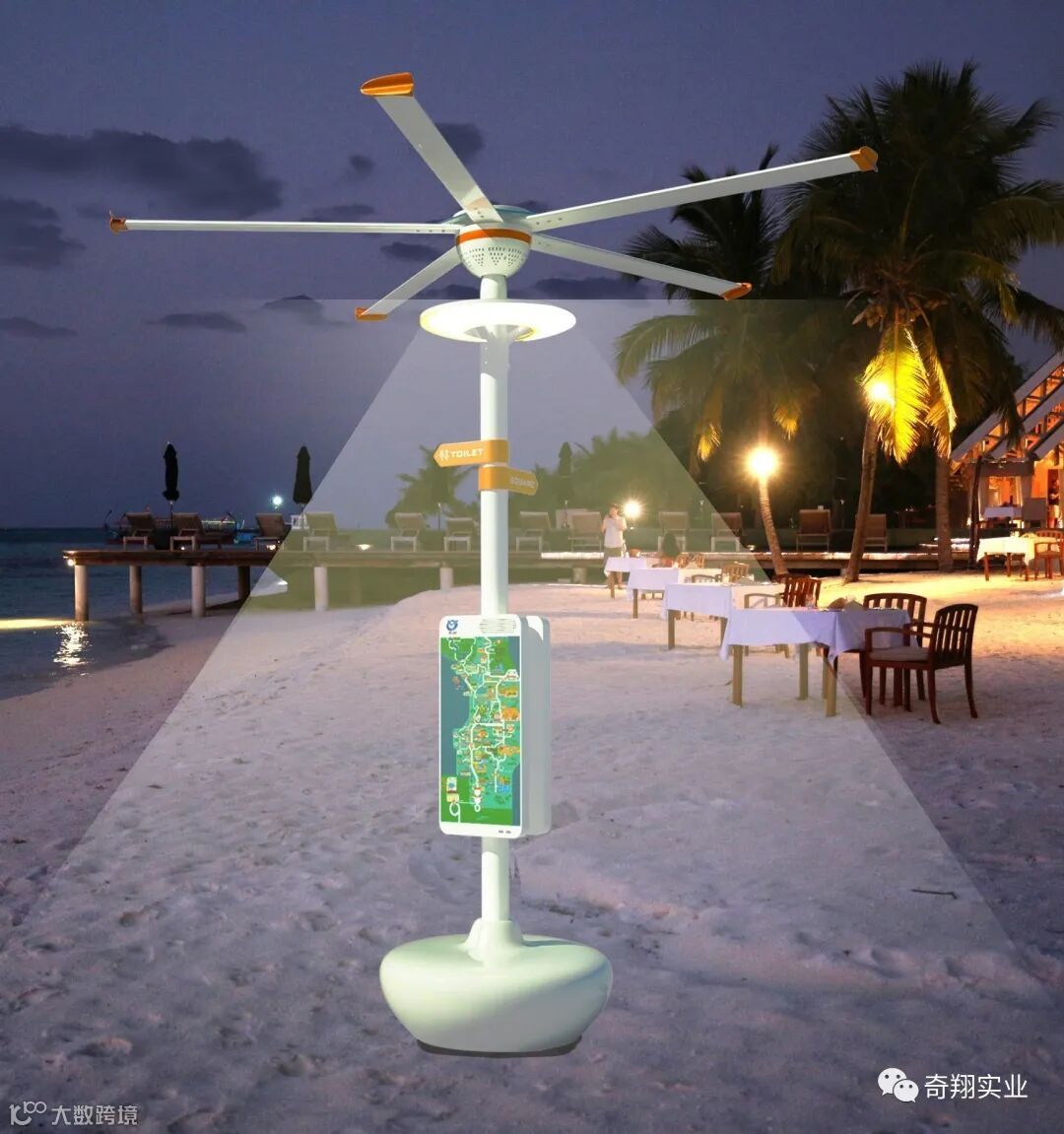 爱立风广泛适用于步行街、小区、别墅,商场、风景区、室外运动场、游乐场、大型商业综合体等各种环境;不仅具备通风降温功能,同时还在带有照明,娱乐和广告牌等功能,可充当于路灯、广告牌以及乘凉椅子来使用,适用于各种场景。“爱立风”的出现,也就标志着大风扇行业正式地从工业转型到商业,同样地也让大风扇这款产品在未来充满了更多的可能性,也为大风扇这个行业开辟了一个全新的道路,打开一个新的大门!