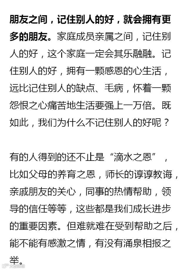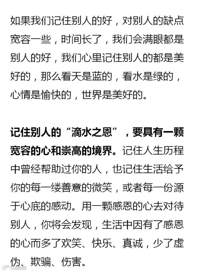 记住别人的好,可以培养自己谦虚的品质。人无完人,对人宽容就是对己宽容;善待别人,其实就是善待自己!专挑别人缺点、不能容人的人,必然自我感觉良好,看不到自己身上的缺点,从而丧失改进提高的机会;记住别人“滴水之恩”的人,则往往能见贤思齐,虚心学习他人身上的优点,因此自己身上的“好处”也会越来越多,人际吸引力就会越来越强,无形中就拥有了更多的精神财富。