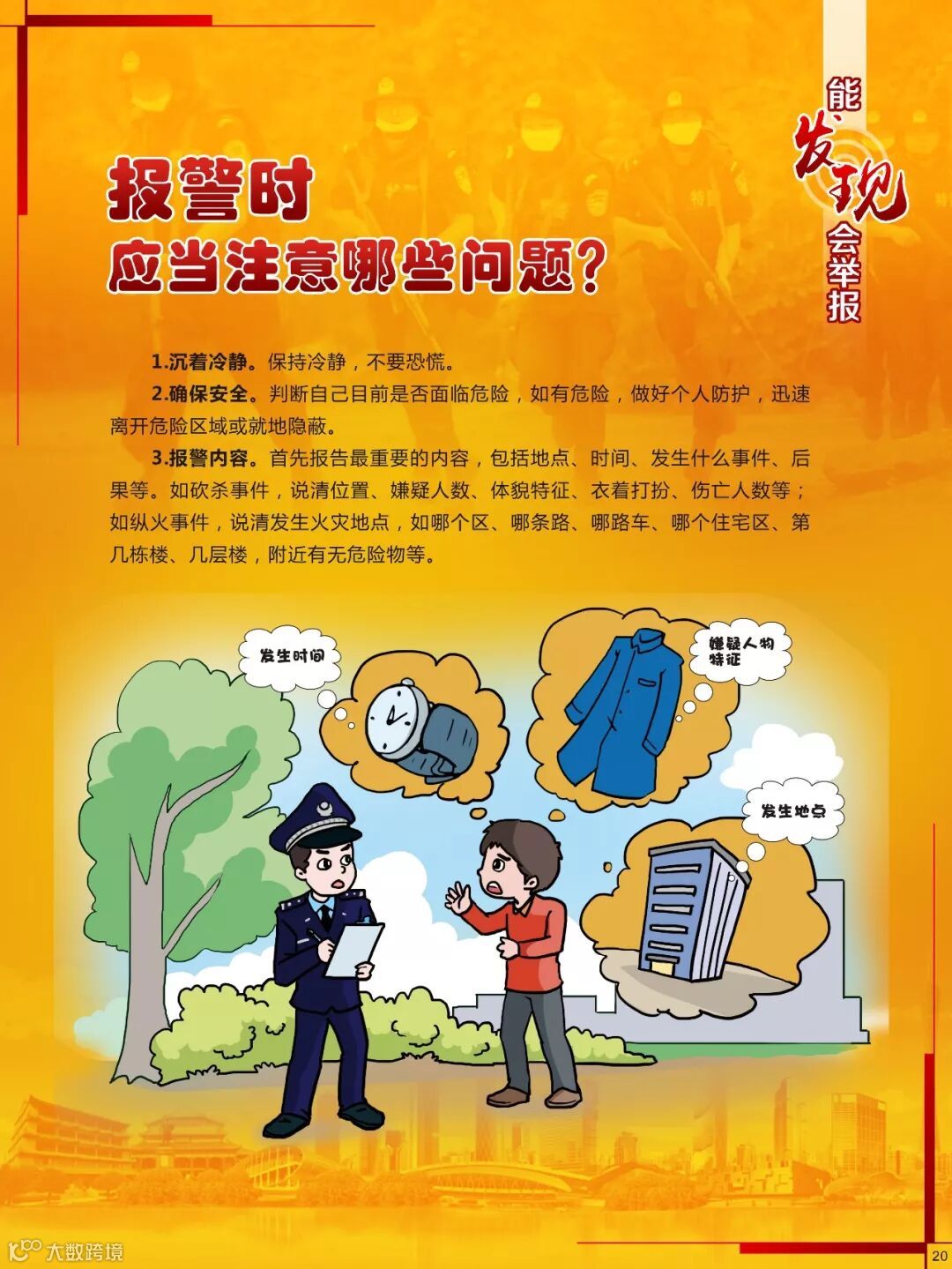 报警时要注意五个要素,即时间、地点、人物、事件、类型,要说清楚在什么地点发生了什么事,有多少人等信息。而一旦不能离开现场,市民还要积极自救、互救,就地取材,积极自我防卫,并积极协助警方调查。