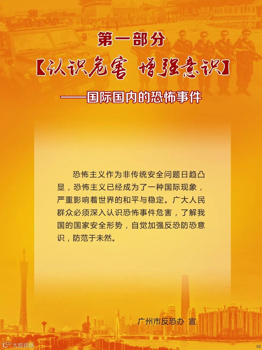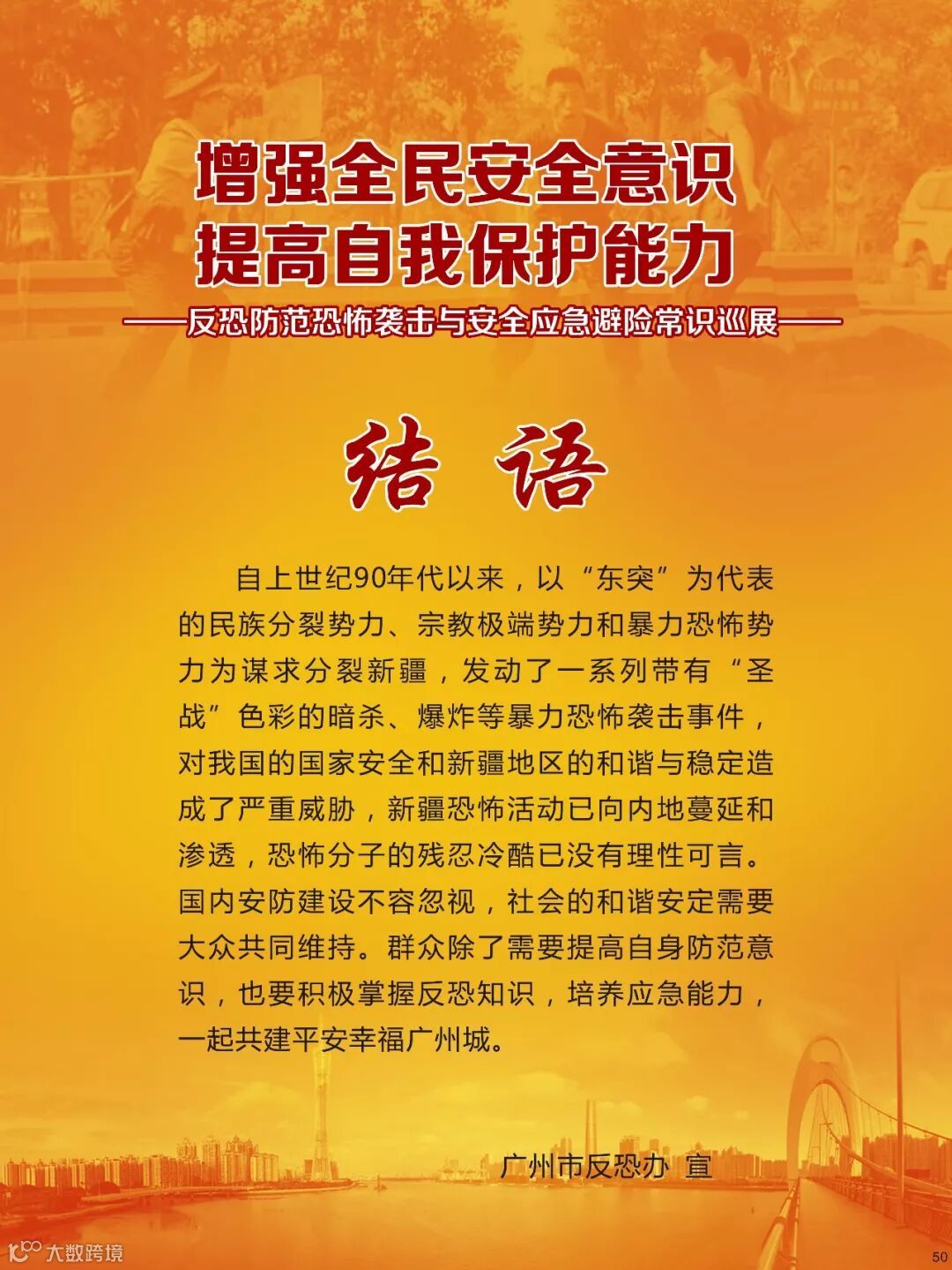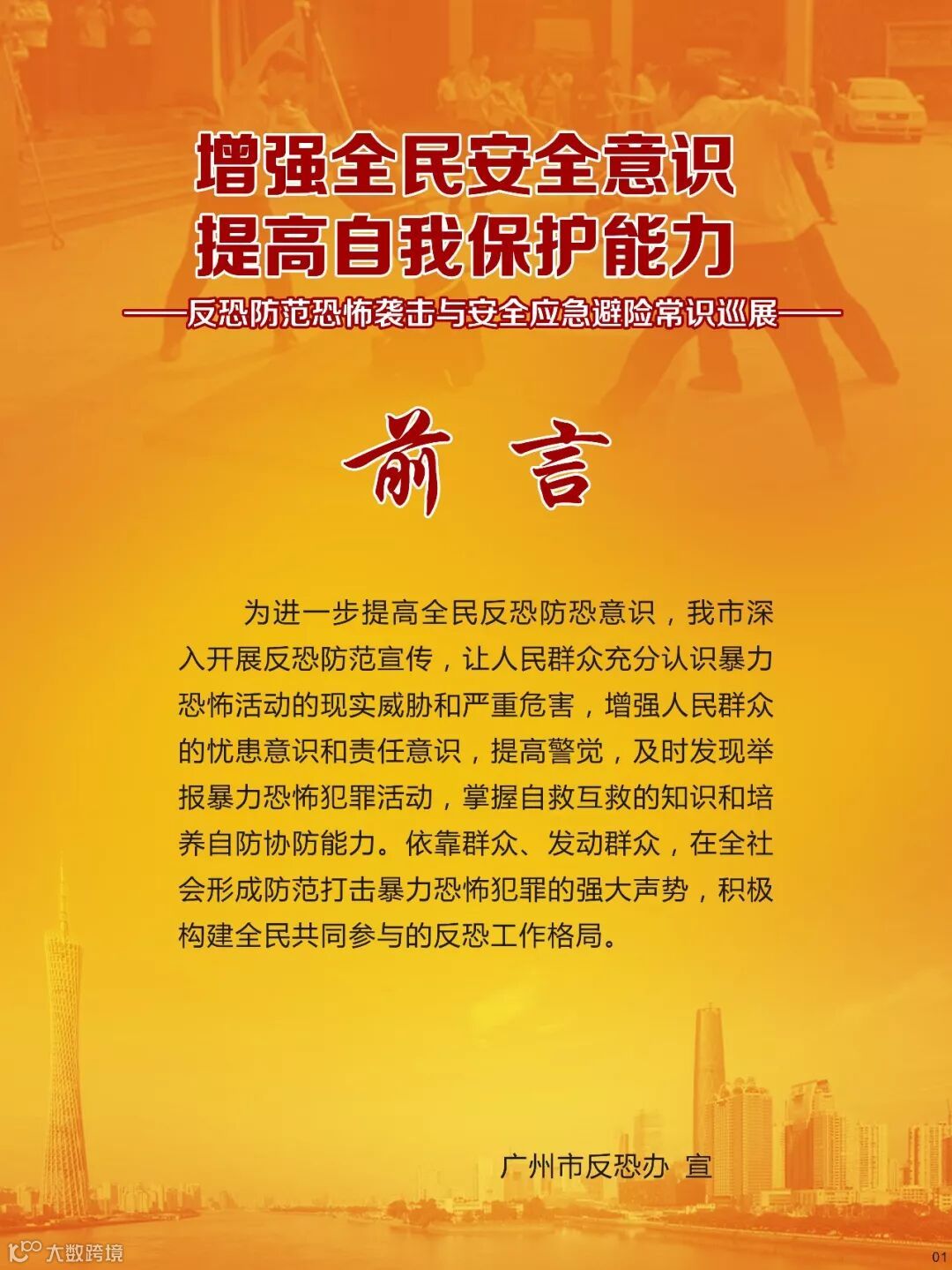 反恐关乎到每个公民的切身安全利益,是每个公民都应该参与到其中的重要行动,是维护社会和谐的重要保障,我们要坚决反对恐怖主义,防止宗教极端思想渗透,共同维护国家安全,共同建设平安羊城!