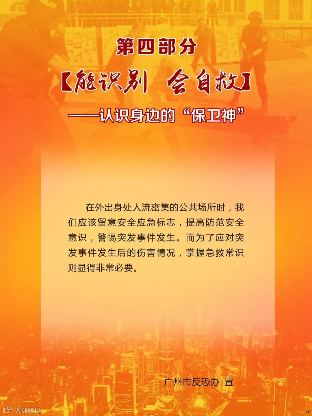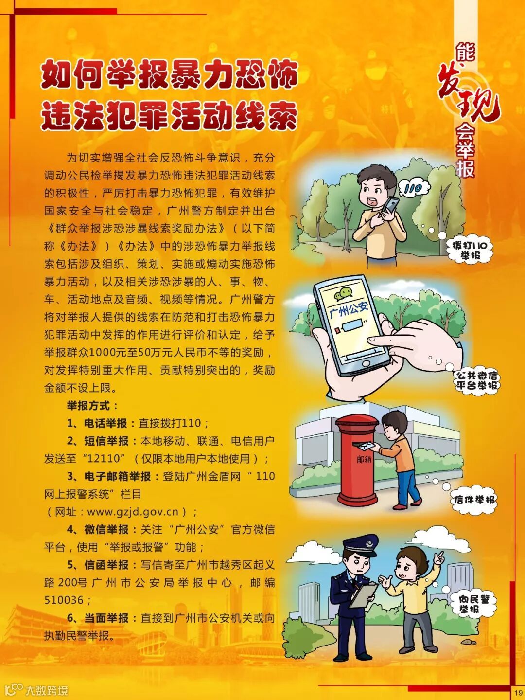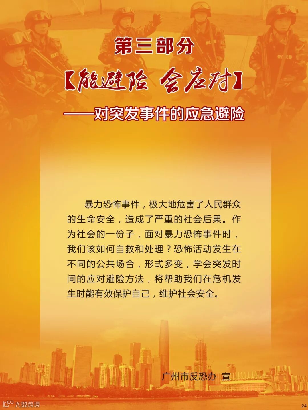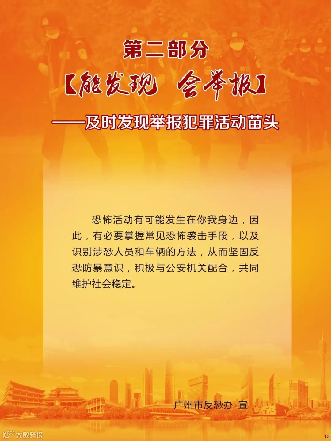 反恐关乎到每个公民的切身安全利益,是每个公民都应该参与到其中的重要行动,是维护社会和谐的重要保障,我们要坚决反对恐怖主义,防止宗教极端思想渗透,共同维护国家安全,共同建设平安羊城!