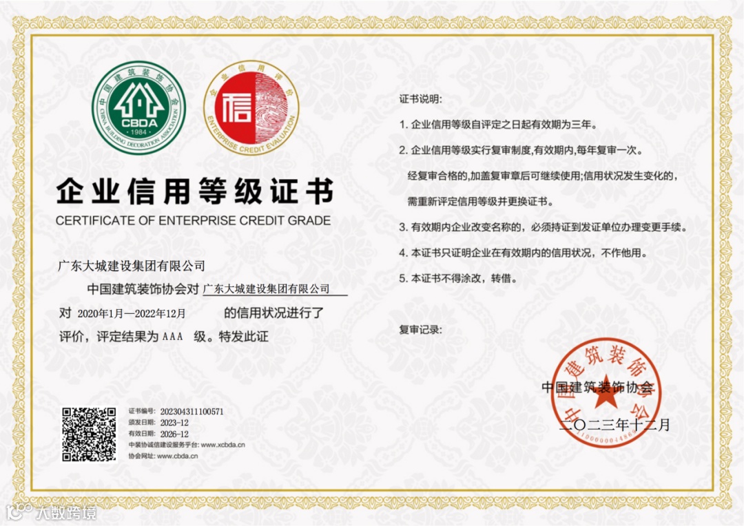 近日,我司获得了中国建筑装饰协会颁发的“AAA级企业信用等级证书”,这一荣誉的获得,是我司市场经营活动诚实守信的正面体现。