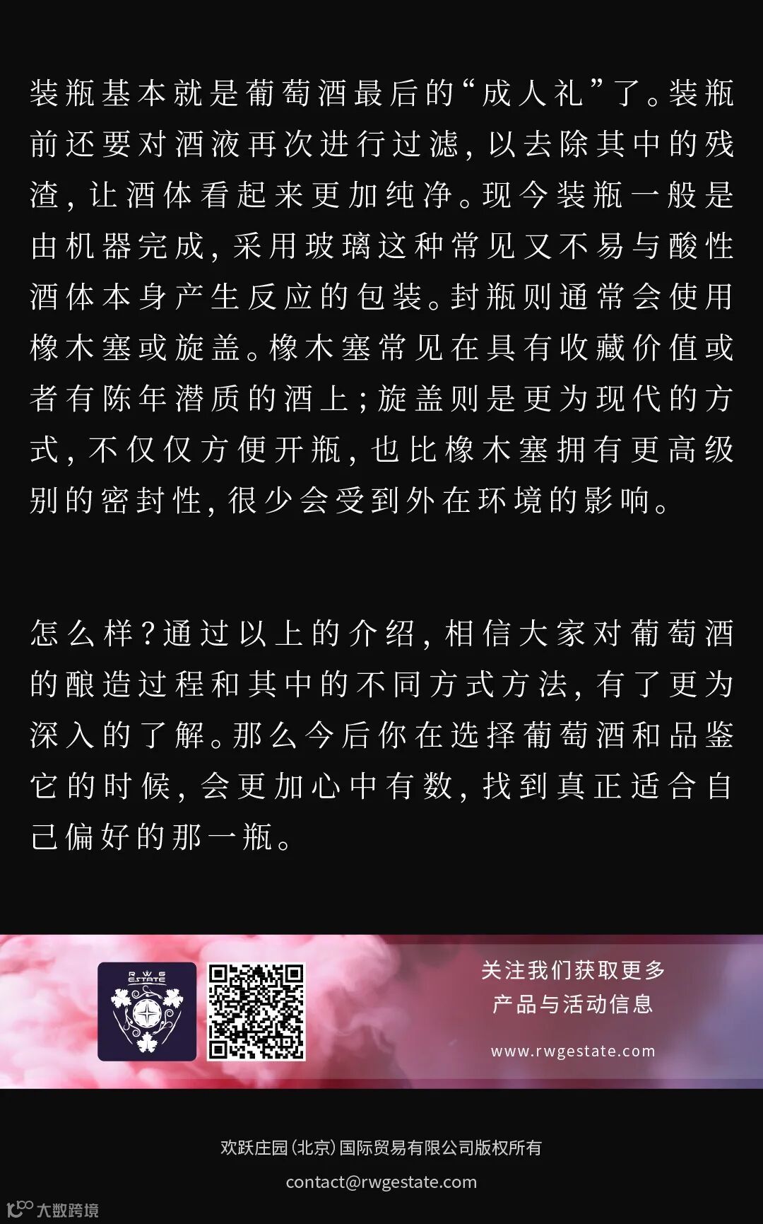 RWG Estate欢跃庄园,由两家位于墨尔本的公司联合建立。在澳大利亚多个知名葡萄酒产地,生产研发即富典型澳洲风味又别具创新的现代葡萄酒产品。欢跃庄园的美酒按照澳大利亚葡萄酒管理局的严格要求在当地生产并灌装,只为带给您更真切的澳洲体验。