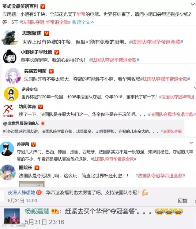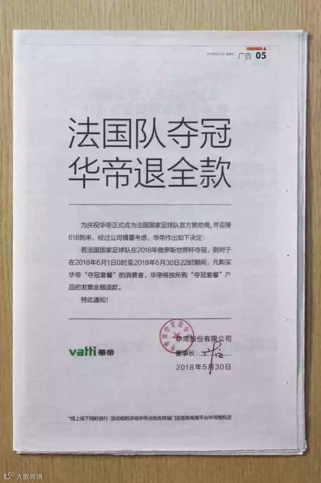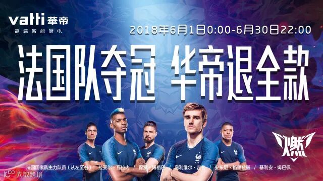 若法国国家足球队2018 年在俄罗斯夺冠,则对于在2018 年6 月1 日0 时至2018 年6 月30 日22 时期间,凡购买华帝“夺冠套餐/单品“的消费者,华帝将按所购“夺冠套餐”/“夺冠单品”产品的发票金额退款。(夺冠套餐仅限500套)