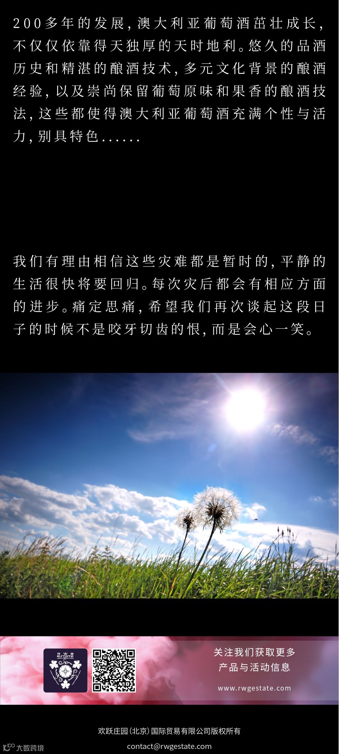 RWG Estate欢跃庄园,由两家位于墨尔本的公司联合建立。在澳大利亚多个知名葡萄酒产地,生产研发即富典型澳洲风味又别具创新的现代葡萄酒产品。欢跃庄园的美酒按照澳大利亚葡萄酒管理局的严格要求在当地生产并灌装,只为带给您更真切的澳洲体验。