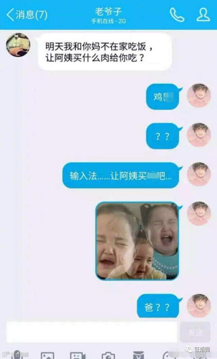 爸妈不在家要出去玩,妈妈发微信问我要吃啥让阿姨做,本来想说吃鸡~吧,结果,输入法你给我站住,谁让你这么有想法的?你还我妈妈!