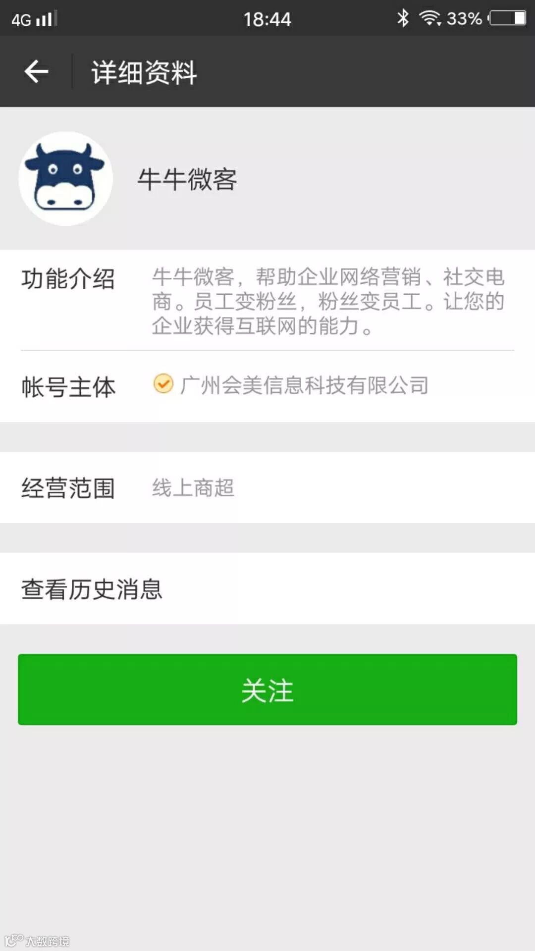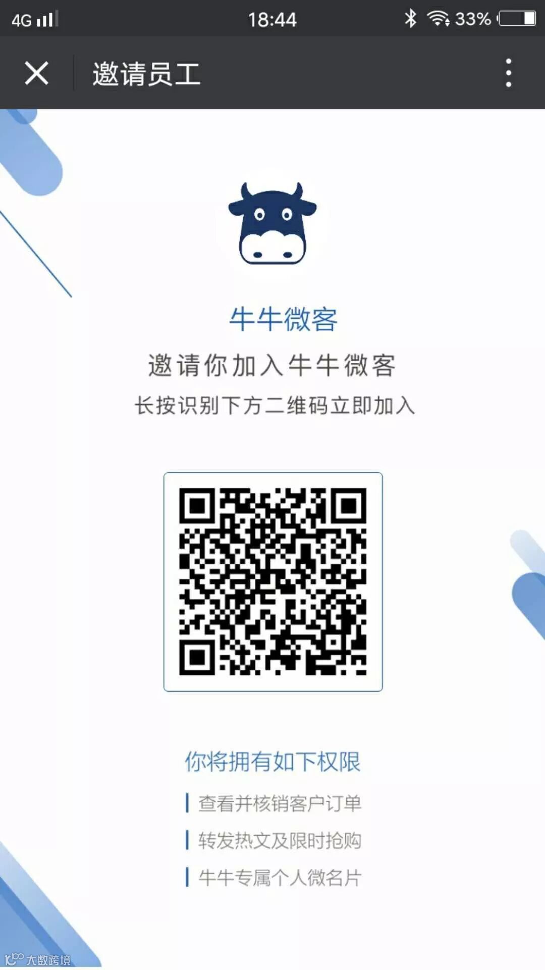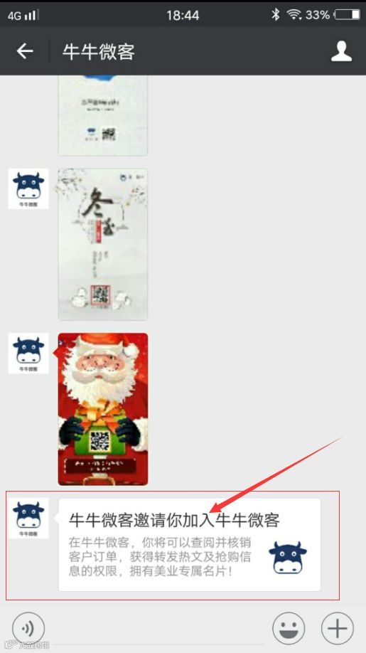 A.员工在微信上收到加入邀请,点击邀请链接,识别二维码,关注“牛牛微客”公众号。