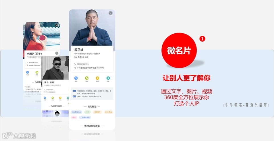 牛牛微客为用户打造微名片,能创建并分享电子名片,分享给好友或者群里。作为随身名片夹,管理朋友的电子名片,盘活纸质名片。牛牛微客运用云技术。云端存储,联系方式云同步更新。
