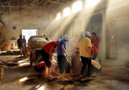 每年端午后,酒师们开始制造曲药。曲药以小麦为原料,先将小麦粉碎,加入水和“母曲”搅拌,放在木盒子里,工人站在盒子里用脚不停地踩。“刚来的工人都受不了这个活,踩两天腿就会疼得下不了楼。”茅台制曲车间的一名工人说。