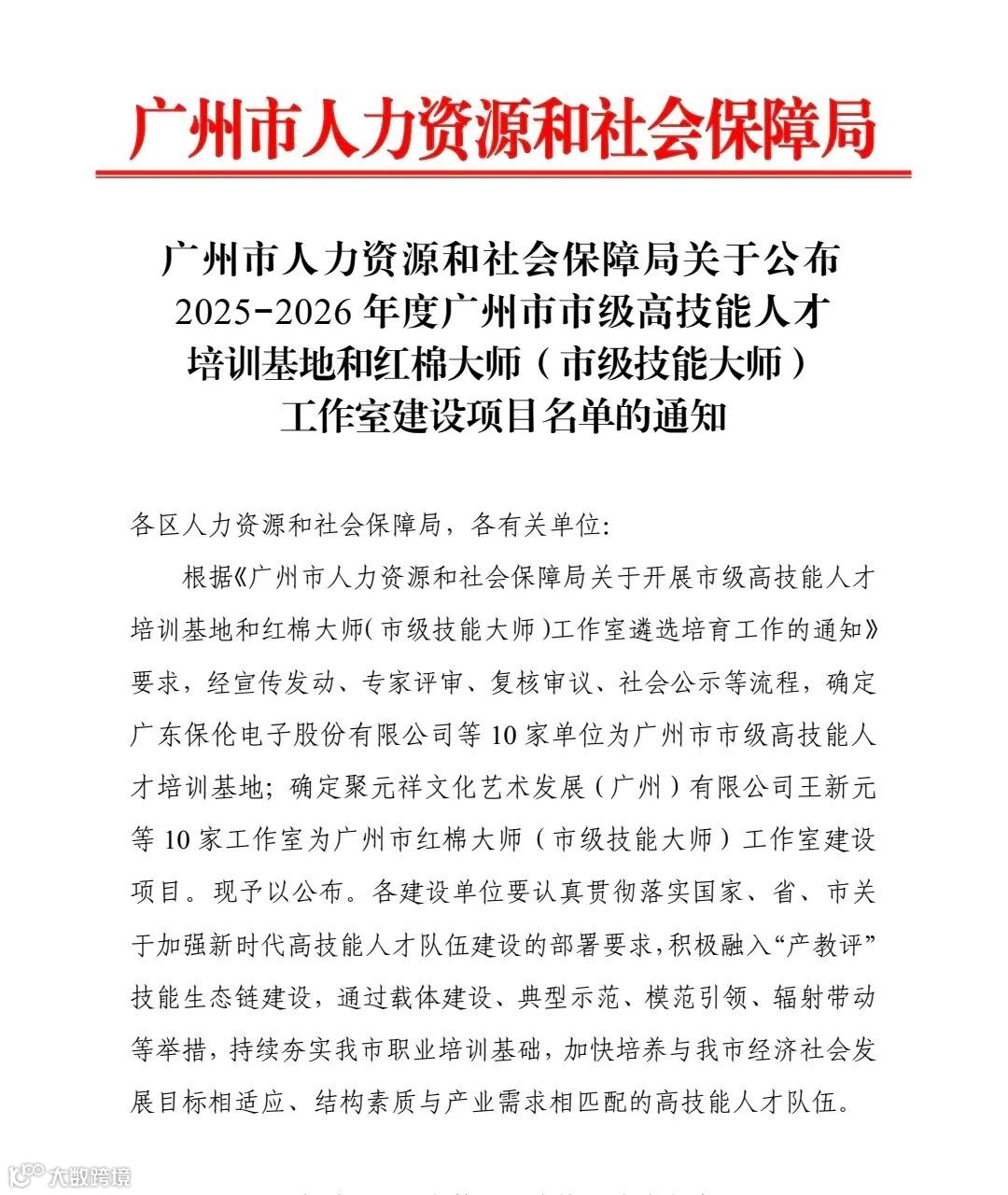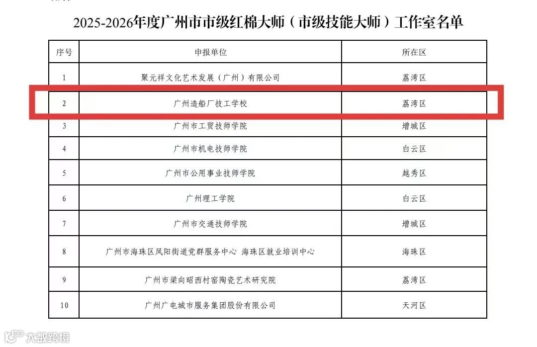 近日,广州市人力资源和社会保障局正式公布2025-2026年度红棉大师(市级技能大师)工作室建设项目名单。中船广州公司旗下广船技校的大师工作室成功入选该名单,成为广州市10家红棉大师工作室之一。