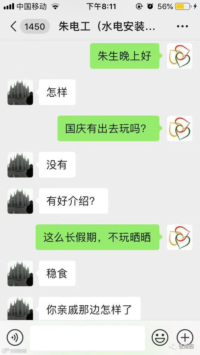 2、撒谎人朱某宏,微信昵称“朱电工”,男,2019年7月17日在微信公众号《征婚园》登记注册,登记婚姻状况为“未婚”,见截图: