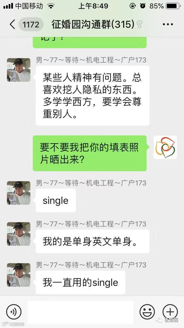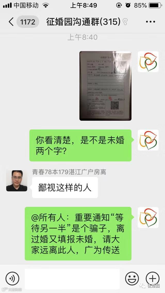 1、撒谎人谢某某,微信昵称“等待另一半”,群内昵称“男~77~等待~机电工程~广户173”,已经离婚,故意填报未婚,具体过程和证据如下:
