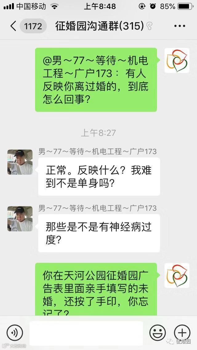 根据活动规则和谢某某要求,此广告表每周周末在天河公园相亲角展示。10月26日,有个女顾客向公司员工投诉,说此广告表信息骗人,并在无数个广告表中找到这张,具体描述了这人不诚实的过程,工作人员意识到事情不可马虎,马上核实真假,10月28日,在微信《征婚园沟通群》里追问谢某某,截屏如下: